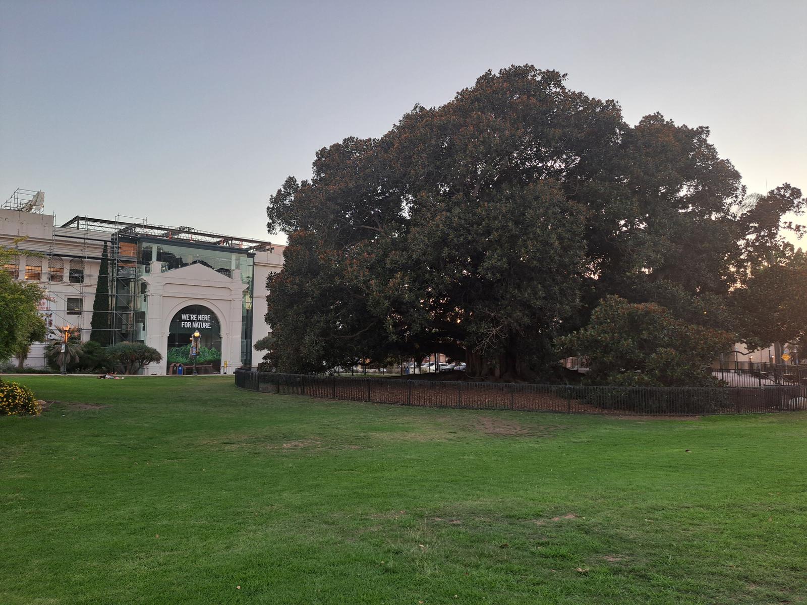 60. В одном из зданий этого комплекса расположен палеонтологический музей, а перед ним это дерево. На фото сложно предать насколько оно огромно. Это австралийская фига (Moreton Bay fig tree), посажена в 1915 году. За 110 лет разрослась до 40 метров в диаметре.